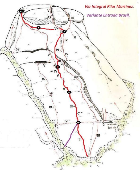Les dues primeres tirades rampeixen força, la tercera ja és mes dreta però és molt curta. Les altres dues les hem empalmat sense problemes. La última ja s'escala una mica més tot i que es deixa fer molt be. s'ha d'estar el cas de no fer caure gaires pedres en els últims metres. la reunió l'hem feta en una sabina .